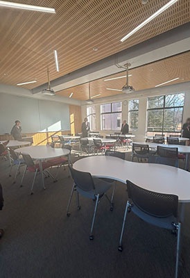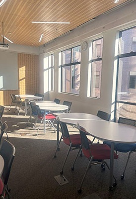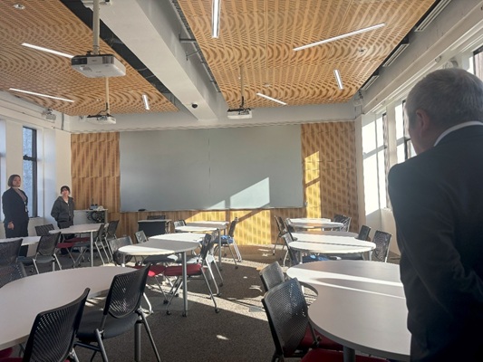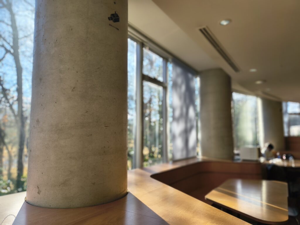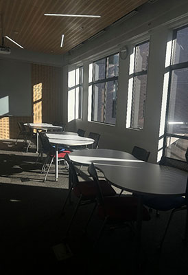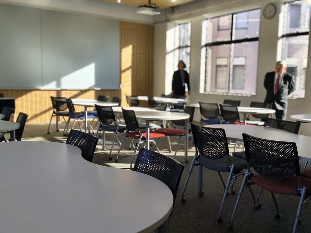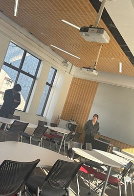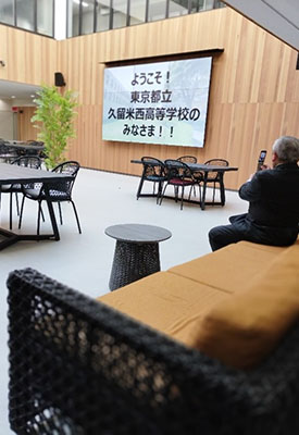 今年新しくできたスペースで、このようにスクリーンに映し出すことができます。机や椅子の形が変わっていって、とてもおしゃれで学生の方もくつろいでいる様子でした。 天井が高く外の明かりが入ってきてとても居心地がよさそうでした。