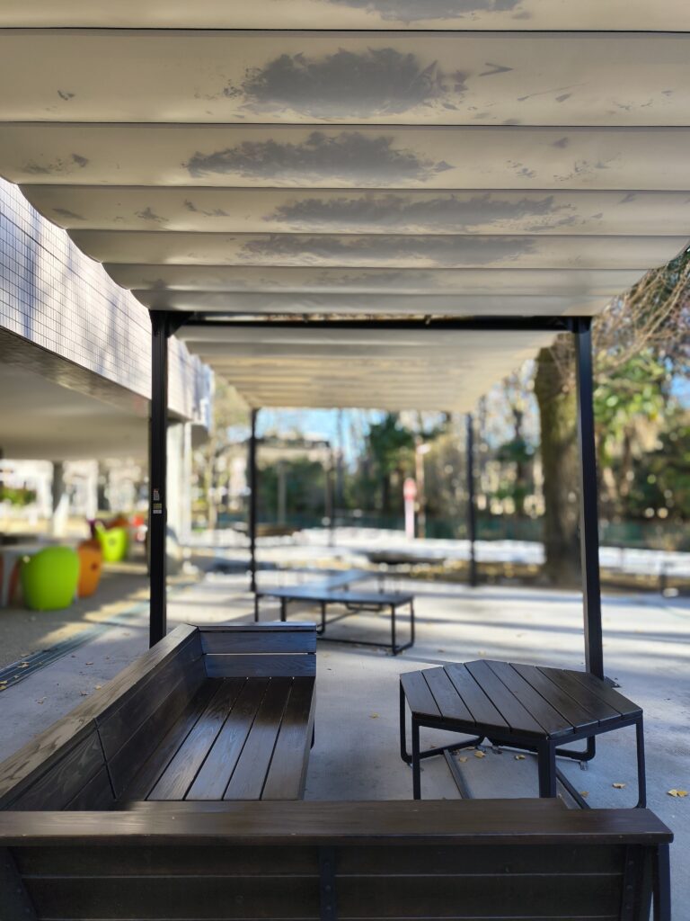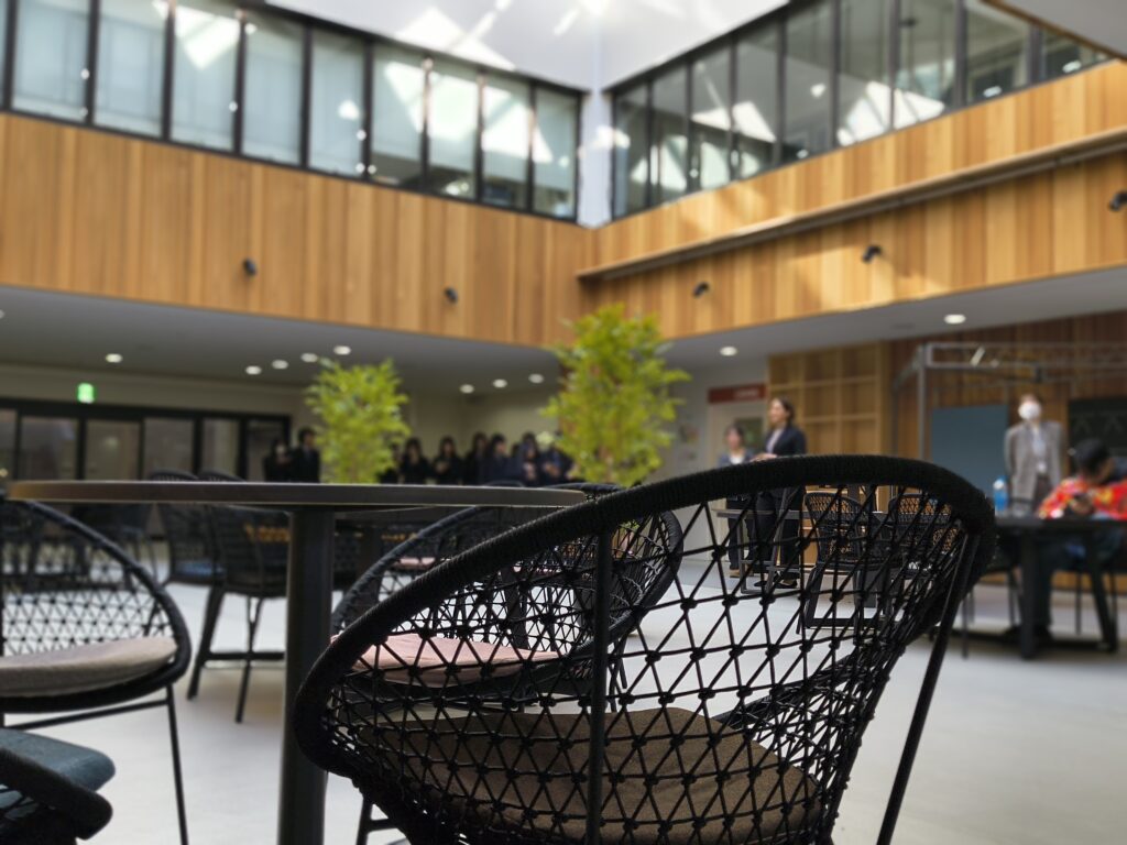 『ホワイエ』という広場は学生たちが休憩したりなど、落ち着ける場所となっていました。机や椅子、ソファーなど新しくリニューアルした場所で、植物が置いてあったりなどとても雰囲気が良かったです。また、心地の良い音楽も流れており場に明るさが出て、より一層雰囲気が増していました。上は吹き抜けになっているため、広々としており、壁の一部が木目状になっているため、とても心の落ち着ける場所となっています。 この広場を使用していた学生さん達はスマートフォンを使用したりなど、自分の好きなことをして安らいでいるのが印象的でした。