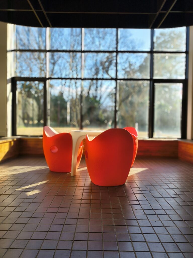 ホワイエというくつろげるスペースがありました。少し洋風な感じで、家具もきれいでした。とても座り心地のいい大きなソファや机やいすもありました。立ちながら使うことができる机もあっていろんな人に使いやすい場所でした。前には大きなスクリーンもあって、普段どんなことに使っているのか気になりました。 利用していた学生さんは、個人での利用が多かったです。パソコンで作業している人や、スマホを見ている人もいました。広々としていたけど意外と静かな空間だったので休憩時間に利用されているのかなと思いました。