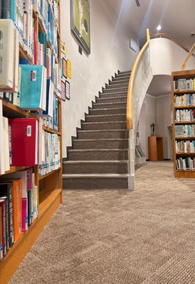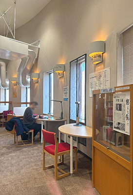 どこにでも勉強するスペースがあって勉強がしやすい大学だと思いました。図書室には本が約10万冊あり自習スペースもあります。 まじめな人が多く利用している雰囲気がしました。二階に行くと本がたくさんあり、展示されている本もありました。とても静かな空間で勉強がしやすそうだと思いました。