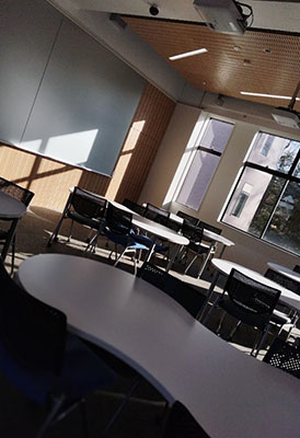 ここのKALC教室という施設ではひょうたん型の机や動かしやすいローラーのついた椅子がありました。ここは主にグループワークなどの際に使われていて、日当たりもよく、教室の前と後ろにプロジェクターと映し出せる白い壁もあり、学生が自分の意見を発表しやすい環境が素敵でいいなと思いました。また、普通の机椅子よりも、グループワーク時に時間短縮になるところもよさそうだと思いました。 利用している学生の意見では、ひょうたん型の机が使いやすく最新と話していました。