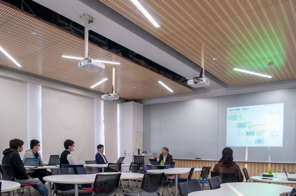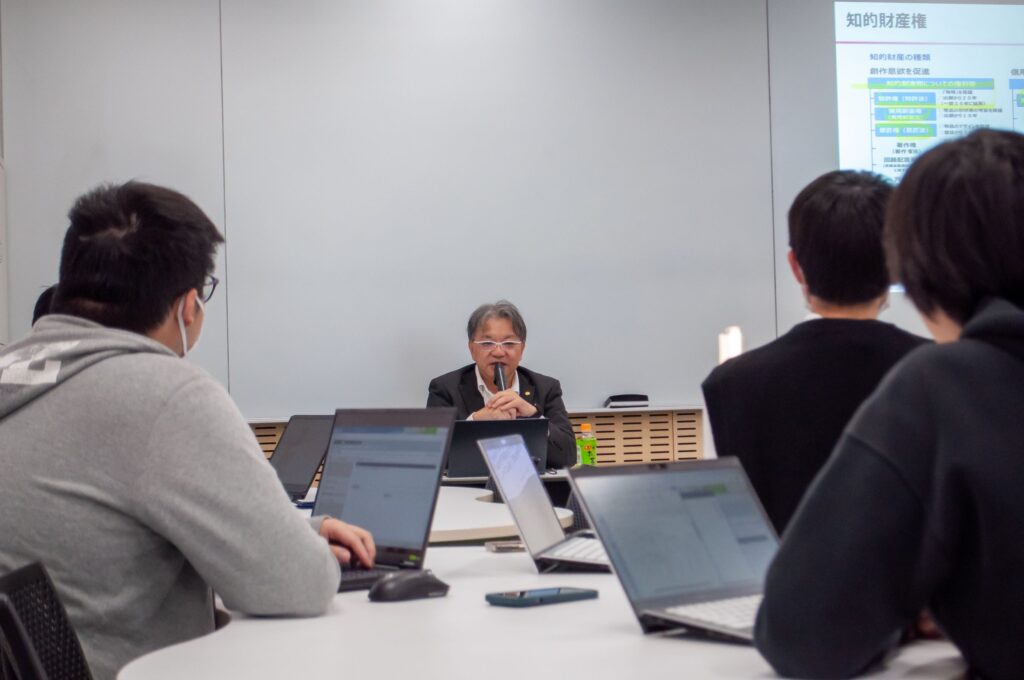 今回の焦点は、製造業の事業を技術者と協働しながら具体的にどのように実現するかという点にありました。講義では、単なるアイデア発想に留まらず、世の中の技術を効果的に探索し、事業機会を見出すための具体的な手法が紹介されました。開放特許の探し方、知的財産権の基礎知識、特許ロイヤリティやライセンス契約といった事業化の過程で必須となる専門知識について、具体的な事例も交えながら解説していただきました。