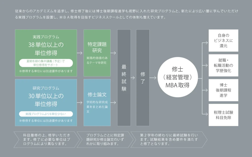 本学はビジネススクールとして、カリキュラム上、2つのプログラムを持っています。多くの年月をかけて練り上げられた科目編成によって、ビジネス現場で直面する課題解決のための実践知を修得し、さらに事例研究・フィールドワークなど実践知を体験的に発見・吸収する機会によって、さまざまなビジネスで多様な解決手段を導き出せる社会人として育成します。