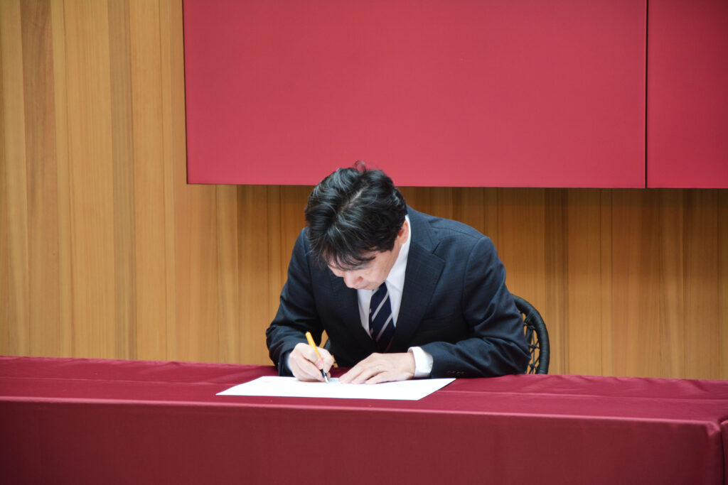 調印式には、ID学園高等学校より 古澤勝志校長、村田健太郎企画部長、嘉悦大学からは 森本孝学長、飯野幸江経営経済学部長、小林誠一事務部長、松本公一キャリアデザインセンター長、日高勝義同副センター長、土橋堅斗同副センター長、瀬戸寿士同職員が出席しました。
